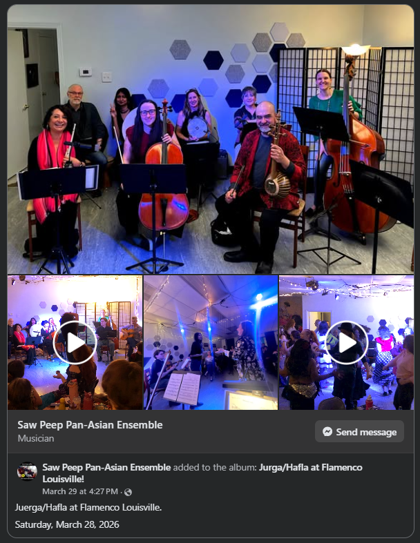By adminMarch 29, 20261 min read Photos and videos from the Juerga/Hafla at Flamenco Louisville have been posted in an album at the Saw Peep Pan-Asian Ensemble page. View the album here. Photos Video